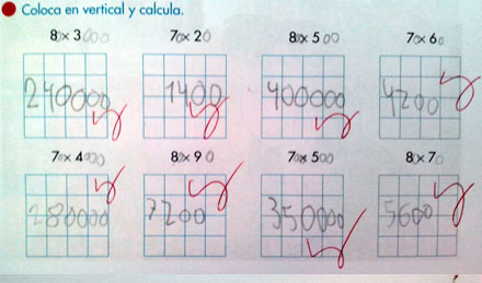 Trabajar el algoritmo ABN no me deja más que sorpresas, una tras otra. En ésta ocasión tal es el dominio de la multiplicación, que ya tienen los alumnos de mi curso de 2º de Primaria, que cuando llegamos a la parte de cálculo en el libro de texto, para ellos no más que un mero trámite, que para no hacerlo aburrido han decidido (ellos por su cuenta) darle un poco de emoción. En concreto hoy en uno de los ejercicios, que os dejo a continuación, les ha dado por añadirles ceros por su cuenta.