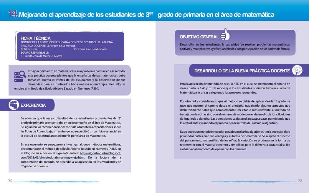 La profesora Judith Matheus Guerra me envía, desde Lima, el pdf con el libro editado por el Gobierno Peruano, que recoge las quice buenas prácticas docentes correspondientes al año 2013, entre las que se encuentra la correspondiente a la introducción del método ABN. La reseña correspondiente a esa experiencia está en las páginas 72 a 75, y una foto con los niños y sus rejilas está en la página 19.