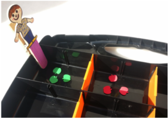 Caja de plástico con compartimentos iguales de las usadas para guardar tornillos,… también se puede usar hueveras, cajas de cartón con separadores, semilleros de plástico rígido, pinzas de la ropa y figuritas de gomaeva (vale cualquier otro material que pueda contarse).