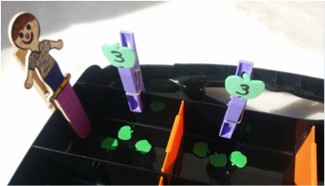 Las columnas pueden ser pinzas con manzanas de goma eva (con número escrito o sin él) y la actividad repartir manzanas por igual en cada celda que corresponda a la fila que encabeza la pinza con la figura de la persona.