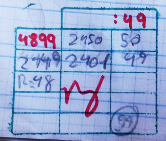 AGUDEZ Y PERSPICACIA. Es por dos cifras, de un alumno de José Miguel de la Rosa cuando estaba en 3º (el alumno, no José Miguel), en el colegio "Alonso de Aguilar" en Aguilar de la Frontera. ¿Descubren cómo lo ha hecho? Él ha visto que el resto parcial (2449) es prácticamente igual a lo que ha repartido en primer lugar. Pero le falta uno, luego no puede ser 50, Son 49. ¿Y qué hace? Resta a 2450 el número 49, y ya tiene los 2401. El resto es fácil. Estas cosas suelen ocurrir cuando se educa el pensamiento y se calcula muy bien.